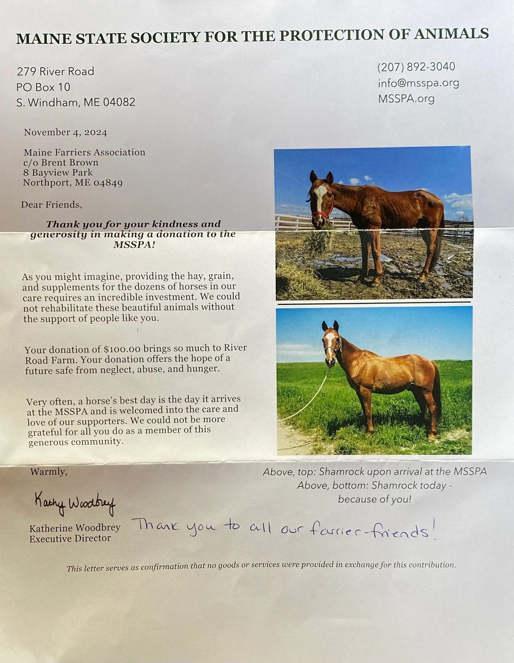 The Maine Farriers Association is proud to have a partnership with the Maine State Society for the Protection of Animals, Windham. Your membership with us helps horses like Shamrock get the care they need and deserve, given by the MSSPA.